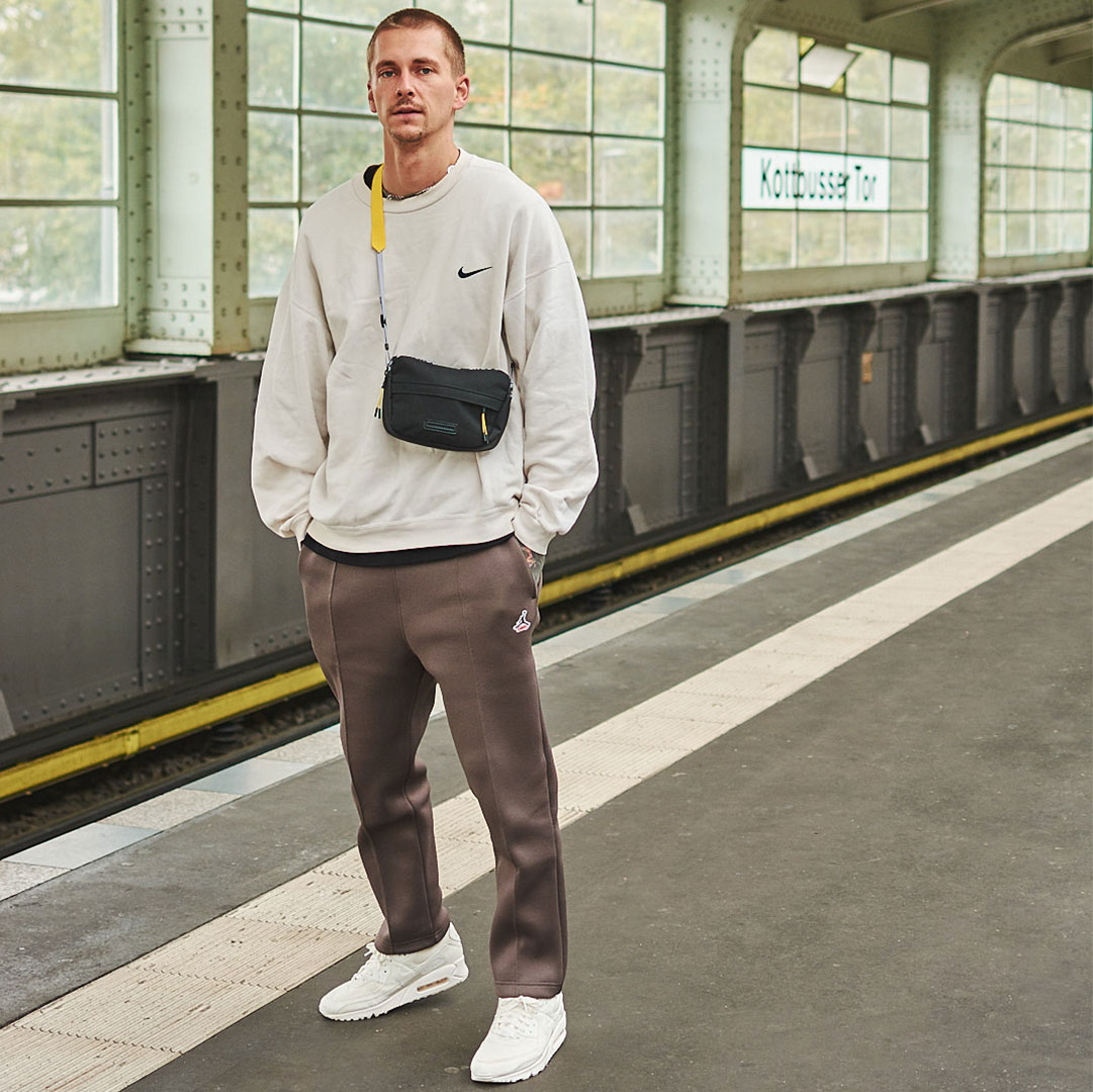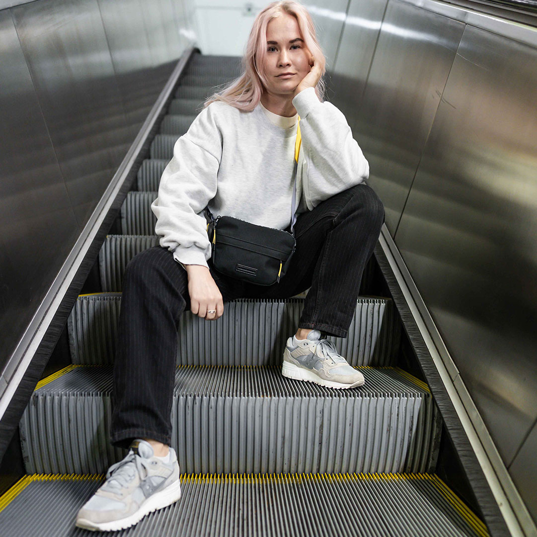 Kvinna korsar gata med UCON Acrobatics x Shoe Shame Vapor Bag i handen — återvunnen väska för sneakersvård och vardagsgrejer i urbant Berlin‑inspirerat samarbete.